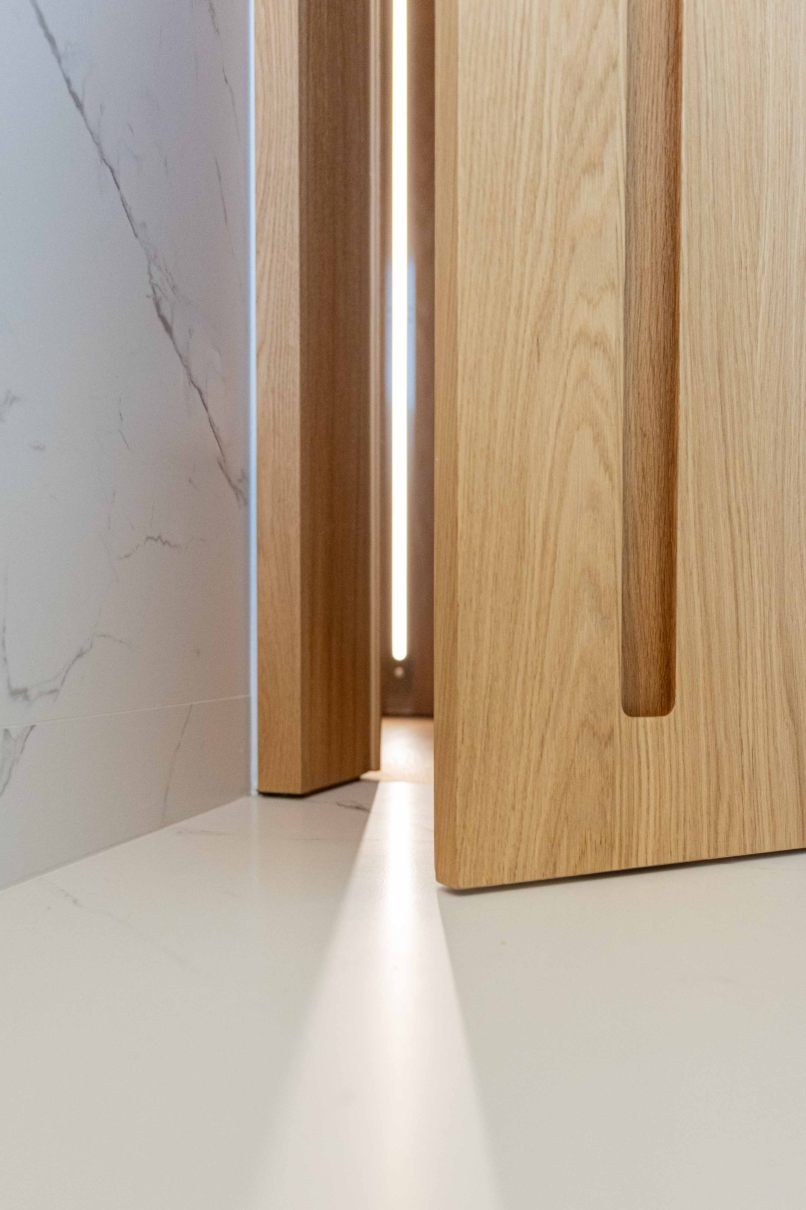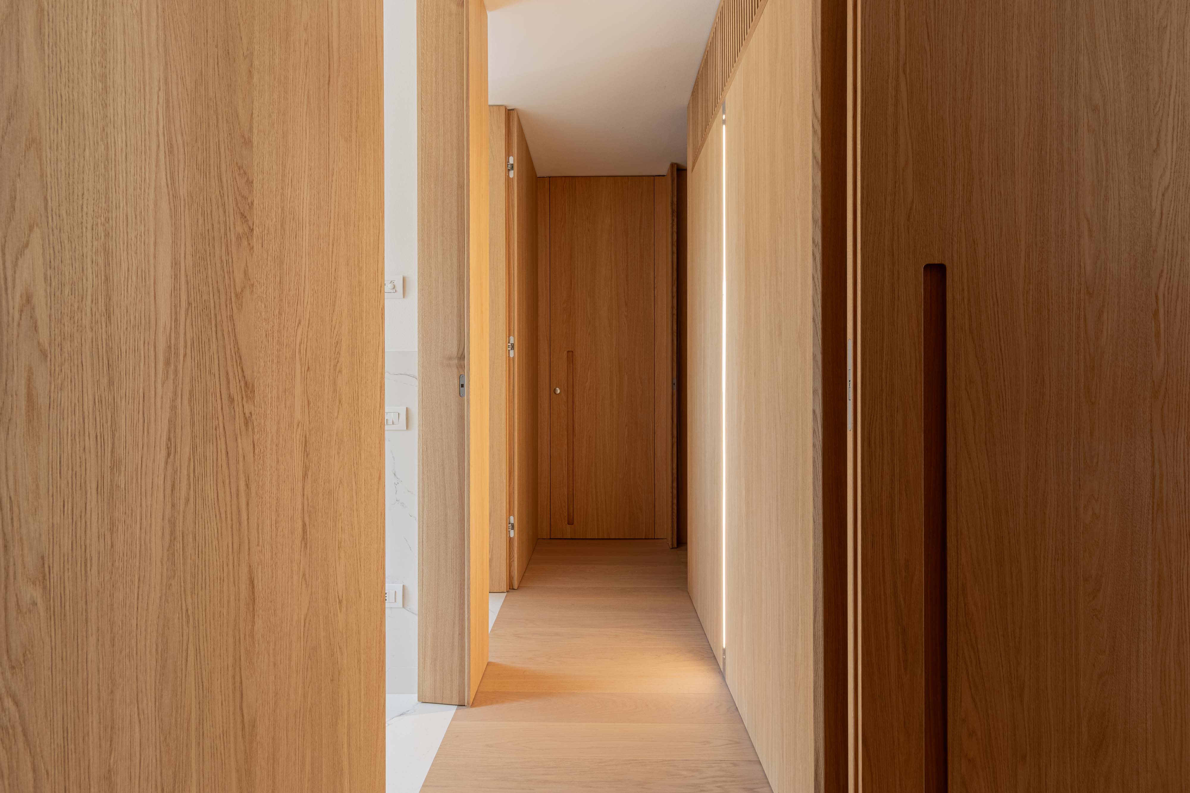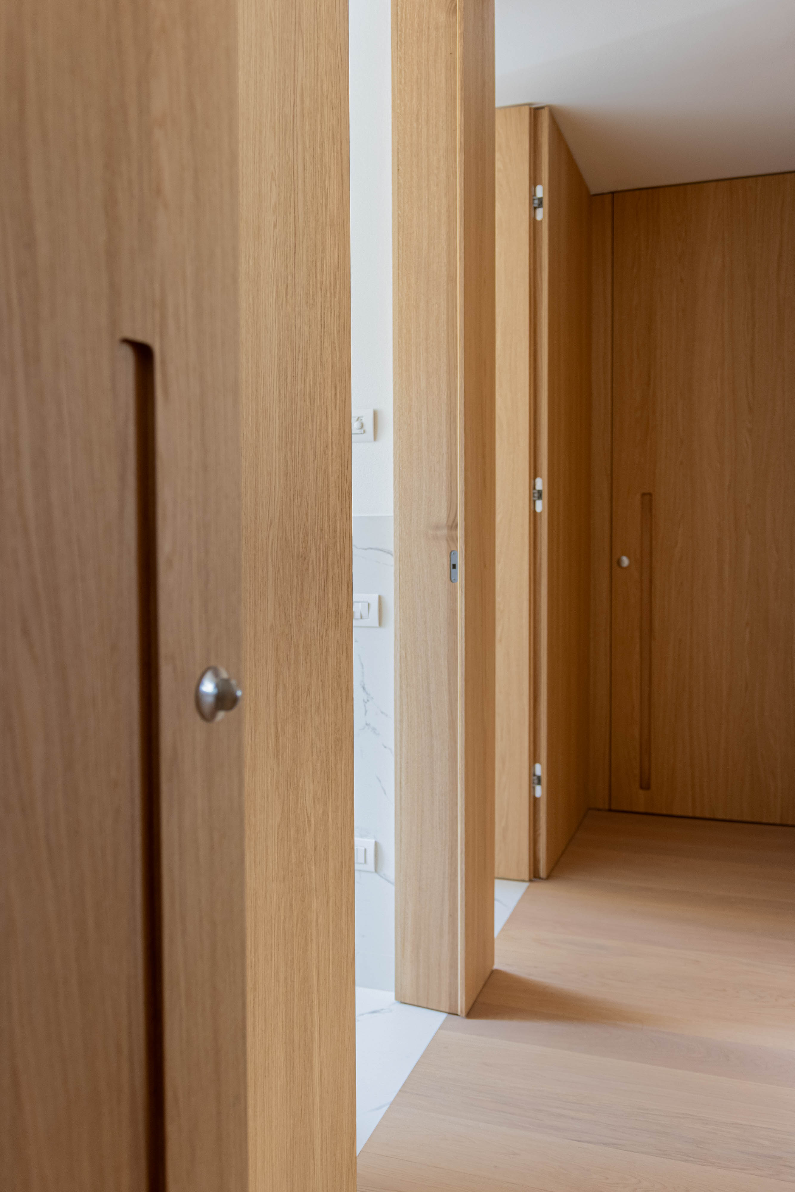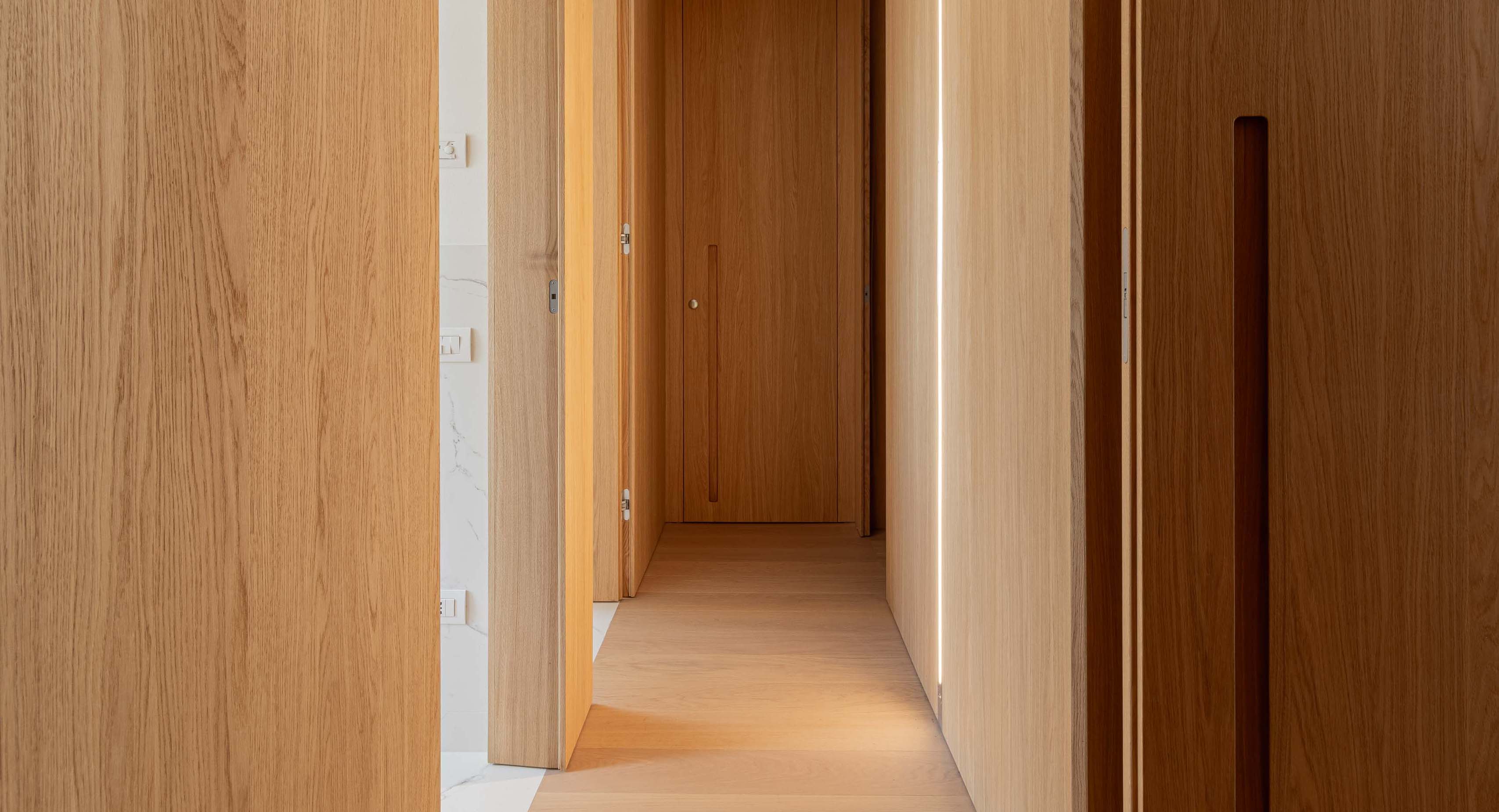 disegnato dall’ architetto Piervittorio Prevedello e realizzato interamente nel nostro laboratorio, le porte interne sono fissate con cerniere a scomparsa a dei montanti inseriti nella boiserie, senza nessun traverso superiore chiudono a filo in modo da creare una visione continua. I maniglioni incassati aiutano l’apertura del battente che è tenuto chiuso con una serratura magnetica, le pareti, cabine armadio e porte sono completamente fissati con un ancoraggio nascosto che mantengono l’ arredamento intatto.